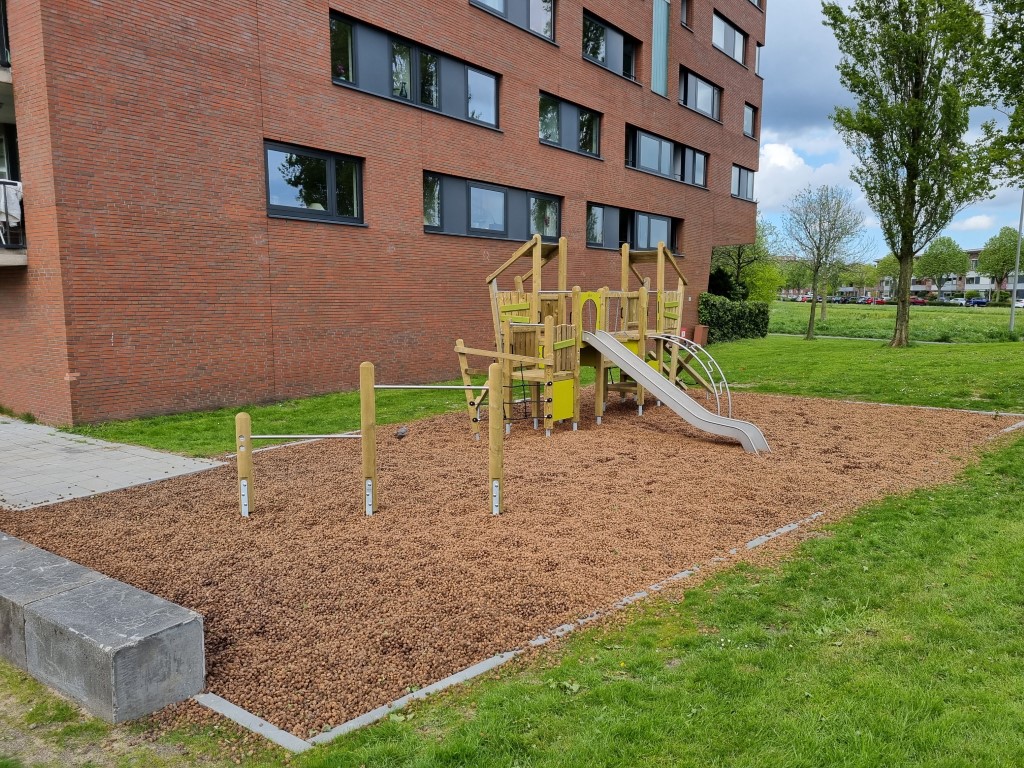 Speelplaats aan de rand van Den Haag waar nieuwe toestellen zijn geplaatst, gelijk in combinatie met een natuurlijke ondergrond.